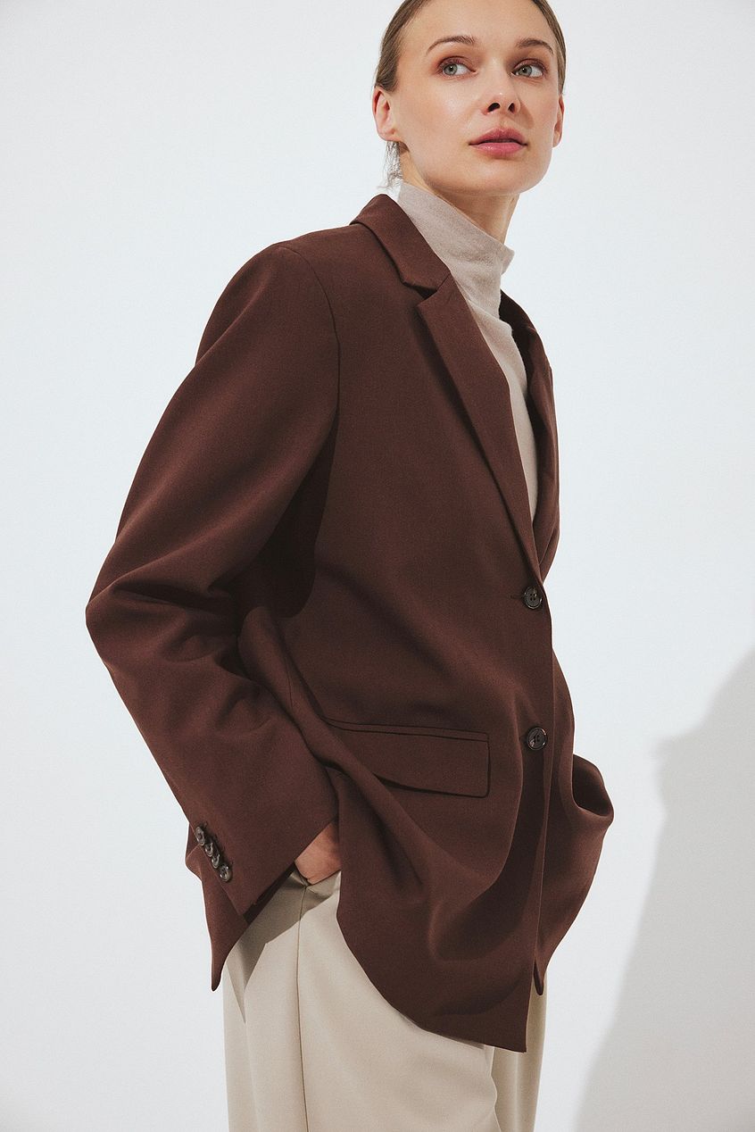 This blazer features an oversized fit. It has padded shoulders and a lapel neckline. The blazer has a button closure down the front, two front pockets and an open back design.