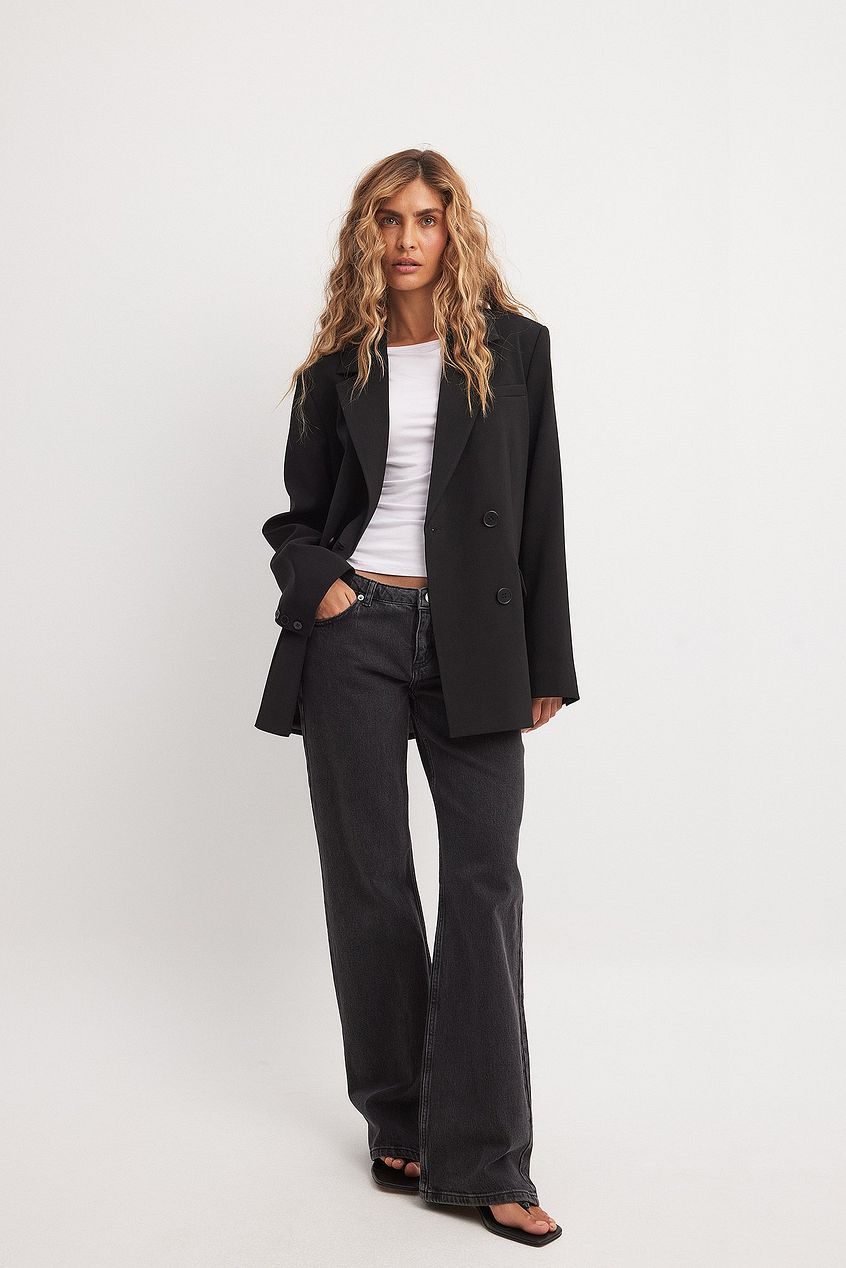 These jeans feature a low waist and a zip and button closure. They have a five-pocket design and wide legs. The color of this product may transfer to itself or other objects. Avoid making contact with light-colored surfaces.